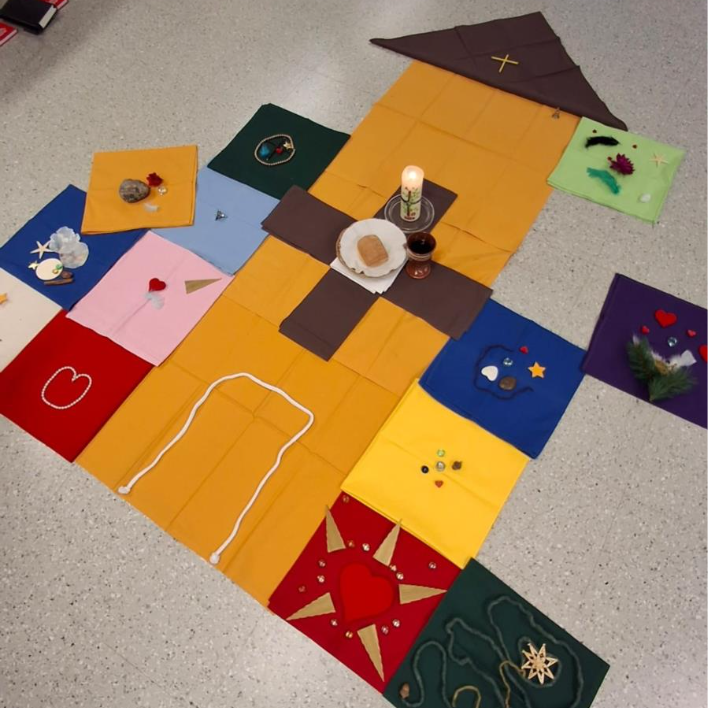 Lattiakuvatyöskentely teemalla Kirkko on muokattu käytettäväksi erityisesti rippikoululaisten kanssa. Työskentely havainnollistaa, miten paljon muutakin kirkko on kuin pelkkä rakennus ja miten jokaisella on tärkeä paikkansa seurakunnassa.